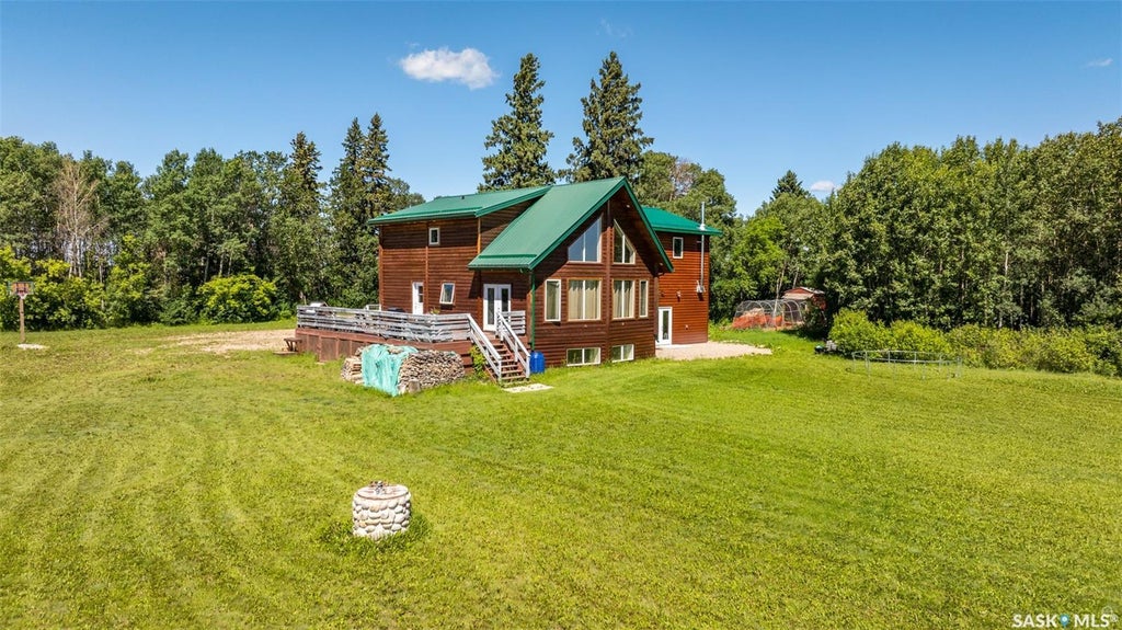 Stunning 2 storey A-frame home with 8 bedrooms and 4 bathrooms near the White Fox River. The main level greets you with an open concept floor plan that effortlessly blends the kitchen, dining and living areas. The space is adorned with beautiful wood paneling and dramatic round wood support beams, creating a warm and inviting atmosphere. The chef inspired kitchen features stainless steel appliances, elegant wood cabinetry and a spacious island with bar seating. The cozy living room with a wood burning fireplace as its focal point and maple hardwood flooring offers direct access to a large deck where you can unwind and enjoy breathtaking country sunsets. This level also includes a large bedroom and a stylish 5 pc bathroom with dual sinks. Upstairs, the loft overlooks the main floor and leads to two additional bedrooms and a 4 pc bathroom, complete with a large soaker tub, stand-up shower and a modern vanity. The basement adds even more living space with a large family room, kitchenette, two bedrooms, a 3 pc bathroom and a laundry/utility room. In 2024, a large addition was completed featuring a 2 car attached garage with a finished interior including a kitchenette and wood stove. The second level of the addition includes four bedrooms and a 4 piece bathroom with laundry hookups. The water supply is a 100ft well with a 6 inch casing and the septic system is a septic tank to a surface discharge. The property is well equipped for horses or farm animals with some fenced in areas, a 24ft x 16ft barn and a 16ft x 10ft shed. A charming garden, firepit, and large deck create an ideal space to relax and take in the surroundings. The property is also just a short distance from the renowned Fort La Corne Forest known for excellent hunting, quading and trail riding. Whether you are seeking a family home, recreational retreat or hobby farm this property truly has it all. Don't miss out on this opportunity to embrace country living at its finest!