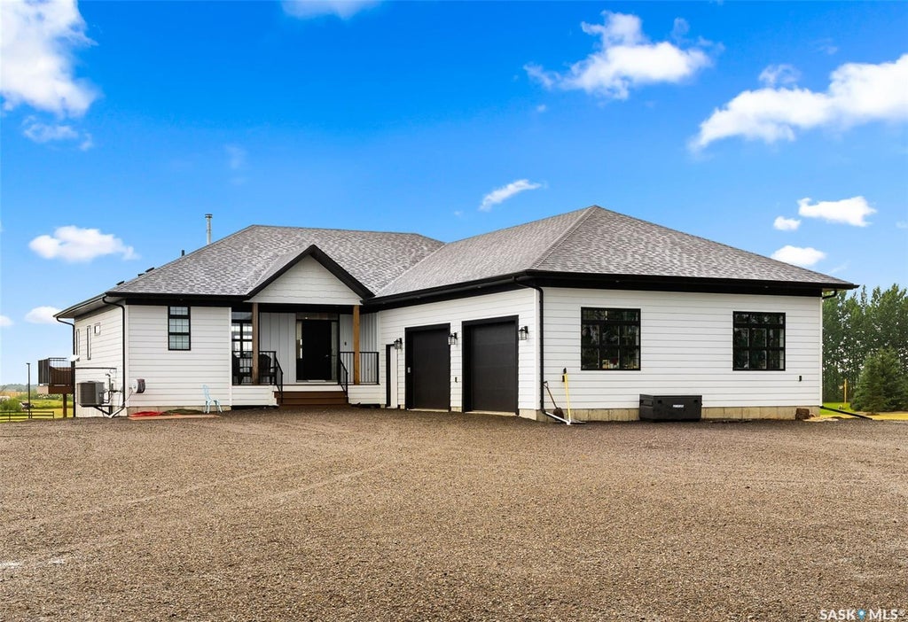 This beautiful walk-out bungalow sits on 3.5 acres in an unbeatable location bordering White City and just minutes from Regina offering the best of both worlds: city convenience and acreage living. As you enter this 2,136 sq ft home, you're greeted by breathtaking prairie views that stretch as far as the eye can see. At the heart of the home is the gourmet kitchen, where a massive island takes center stage—perfect for hosting. The open-concept design seamlessly connects the kitchen, dining area, and living room, where a wood-burning fireplace adds warmth and charm. An expansive butler’s pantry offers extra cabinetry, a prep sink, and built-in shelving to keep everything tucked away and within reach. The primary bedroom is a cozy retreat with an electric fireplace, patio doors to the balcony, stunning prairie views, a spacious ensuite with soaker tub, and a walk-in closet. The main floor also features a second bedroom, full 4-piece bathroom, laundry room with sink and built-ins, an office nook, and a mudroom with walk-in closet that leads into the oversized 34x29 garage with in-floor heating. Downstairs, the walk-out basement includes a spacious rec room, 4-piece bathroom, in-floor heating, and roughed-in plumbing for a future kitchen or wet bar. You’ll also find three generous bedrooms—two with walk-in closets and one with a custom vanity.