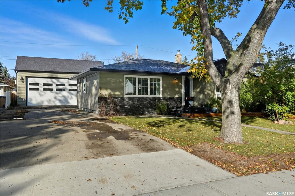 Welcome 3318 4th Avenue N! This beautifully renovated 1,054 sq ft bungalow blends modern updates with timeless charm. Offering four bedrooms and two bathrooms, the home’s thoughtful layout provides flexibility — one bedroom is attached to the primary suite, ideal for a nursery or dressing room, while another has been converted into a home office. The main bathroom features a heated tile floor and a charming clawfoot tub for a touch of luxury. The farmhouse-style kitchen brings warmth and character to the heart of the home. The lower level offers incredible versatility — it can serve as a non-regulation suite or as a fantastic entertainment space complete with a wet bar and room for a full-size fridge, electric fireplace and tons of storage. Outside, you’ll find a xeriscaped backyard designed for easy maintenance and year-round enjoyment. The shop-quality garage is a dream — 32x32 in size with an oversized door, steel I-beam, radiant heat, air conditioning, and a built-in radial arm saw (to stay). Recent updates/upgrades include newer siding and windows (2022), newer shingles, new LVP flooring, upgraded lighting, and motorized blinds. Seller states the north wall has been blue-skinned with weeping tile installed and run out to the street. Situated on a mature, quiet street in Coronation Park, this home is move-in ready and packed with upgrades — perfect for anyone seeking comfort, functionality, and craftsmanship. This home absolutely must be seen to be appreciated!